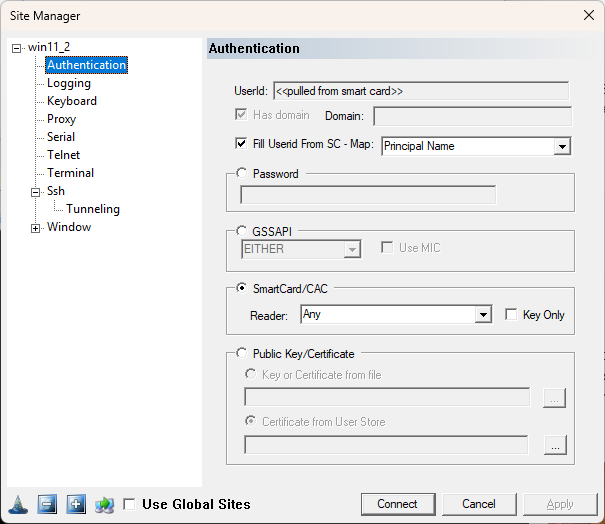 Select "Authentication" tab to provide your MFA, Choose SmartCard/CAC, Reader: Any, Fill UserId from SC - Map: Principal Name. Choose Apply to save it.