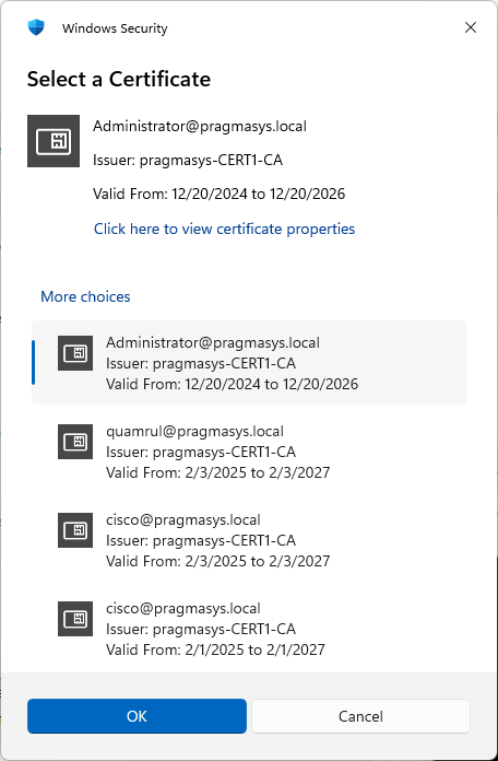 Select "Connect" button and you will be provided a certificate to choose if multiple certificates are in the smartcard/Yubikey. Choose a certificate and then hit OK. Or if it is just one certificate that was there, hit OK.